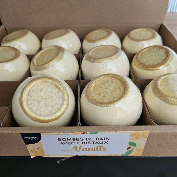 Bombe de bain avec cristaux au milieu pour une évasion sensorielle.