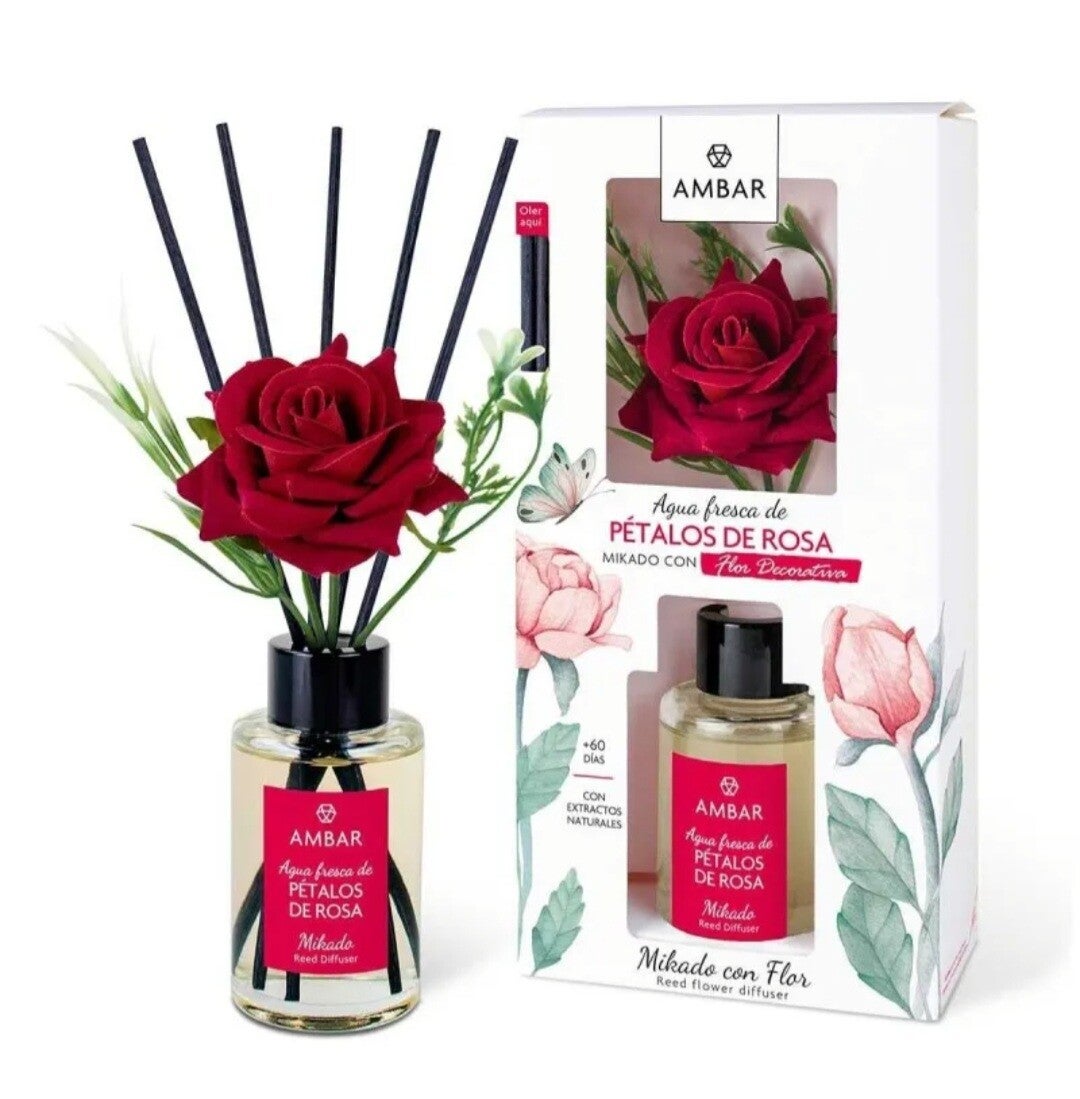 Mikado parfum pétales de rose avec une jolie rose rouge.