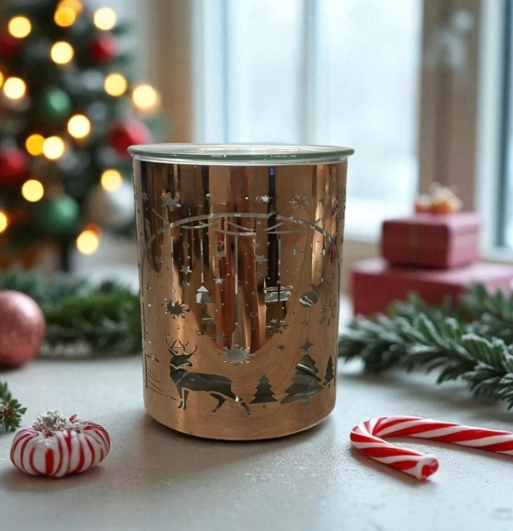 Doté d’un design en métal cuivré et d’un motif « arche de Noël » découpé au laser (sapins, étoiles, flocons et renne), il diffuse vos senteurs préférées tout en projetant de magnifiques reflets lumineux.
